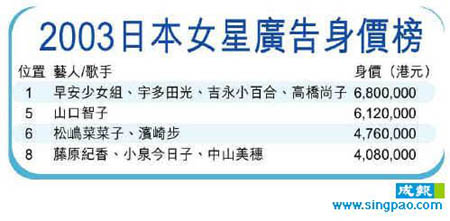 而曾被指為是紀(jì)香姐接班人的米倉(cāng)涼子,雖與NHK大河劇《武藏MUSASHI》的拍檔市川新之助傳緋聞,但后者被踢爆已有一名私生女,連帶她的形象亦受拖累,身價(jià)由原來(lái)的三百零六萬(wàn)港元,下降至二百七十多萬(wàn),位列第十六位。而人多勢(shì)眾的早安少女組,身價(jià)則保持不變,繼續(xù)以六百八十萬(wàn)港元位列榜首。