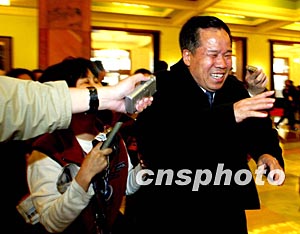 交通部部長張春賢三月十七日出席十屆全國人大一次會議時接受中外記者采訪。作者:張煒