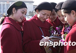 十屆全國人大一次會(huì)議第七次全體會(huì)議十七日在北京人民大會(huì)堂召開,圖為會(huì)議禮儀小姐在翻看與代表的合影。作者:廖文靜