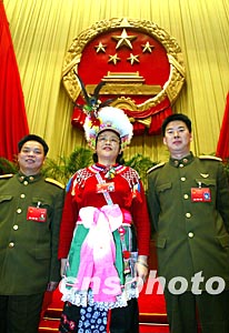 臺灣省代表與解放軍代表十七日在十屆全國人大一次會議第七次全體會議主席臺上,利用選舉計票間歇合影,留下珍貴紀念。作者:毛建軍