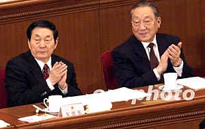 朱镕基、李嵐清三月十八日參加十屆全國(guó)人大一次會(huì)議閉幕會(huì)。作者:盛佳鵬
