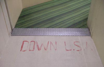 在巴格達(dá)薩達(dá)姆國(guó)際機(jī)場(chǎng),一出機(jī)艙就能看到地上有幾處“打倒美國(guó)”的字樣。