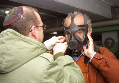 2003年3月18日在耶路撒冷分配中心,以色列軍隊(duì)的士兵指導(dǎo)以色列人使用防毒面具,軍隊(duì)今天命令以色列人準(zhǔn)備封閉的房間來避免伊拉克可能使用的化學(xué)攻擊帶來的危害。
