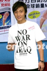 歌星方力申3月18日在香港出席一宣傳活動,身穿印有NO WAR ON IRAQ字樣的T恤,希望戰(zhàn)事不會爆發(fā)。中新社傳真 鄧慶樂 攝