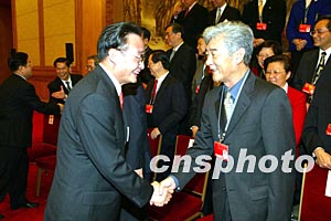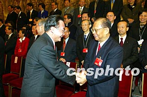 吳邦國委員長十八日下午在北京人民大會堂會見出席十屆人大一次會議的港澳代表,圖為吳邦國與澳門代表賀一誠握手。作者:毛建軍