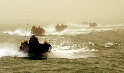 英國海軍陸戰(zhàn)隊(duì)突擊兵和美國海軍陸戰(zhàn)隊(duì)員們想重演二戰(zhàn)時(shí)西西里島登陸戰(zhàn)的場面,可伊拉克軍隊(duì)卻不配合:當(dāng)?shù)貢r(shí)間20日晚,科威特北部的美英重炮部隊(duì)、阿拉伯灣北部水域的海軍艦炮、巡航導(dǎo)彈和美國航母起飛的艦載機(jī)同時(shí)對伊拉克第二大城市巴士拉的戰(zhàn)略門戶――法奧半島進(jìn)行了煞有介事的狂轟濫炸。