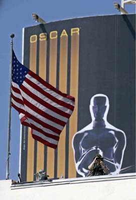 世界電影界年度盛事之一的奧斯卡頒獎典禮,將于美國西部時間23日夜(北京時間24日上午)舉行。時值伊拉克戰(zhàn)事進入白熱化之際,洛杉磯警方已布下重兵,防止恐怖攻擊。圖為奧斯卡典禮會場頂樓,一名警察在照片右下方的小金人肖像前的制高點進行監(jiān)控。(美聯(lián)圖)