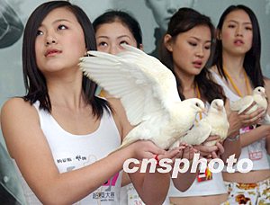 正值伊拉克戰(zhàn)爭之際,在廣州參加“納愛斯雕牌2003超級模特選拔賽”的佳麗,手捧和平鴿祈盼世界和平、反對戰(zhàn)爭。作者:錢興強(qiáng)