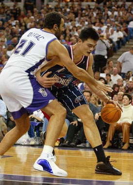 本場比賽姚明上場33分鐘,得到本賽季第25次兩雙,11分和19個(gè)籃板球。