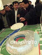 2008年北京奧運(yùn)會(huì)主體育場——國家體育場設(shè)計(jì)方案三月底在北京向公眾展示,三個(gè)方案成為最終的候選方案。圖為由日本設(shè)計(jì)機(jī)構(gòu)與中國清華大學(xué)建筑設(shè)計(jì)研究院合作推出的候選方案。作者:武仲林