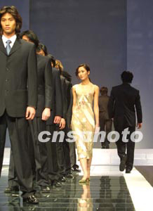 “款式與時尚同步”的愛都品牌西裝三月二十八日亮相于2003北京中國國際時裝周的T字臺上,深受女士們的青睞。作者:史利