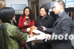 正在北京舉行的2003中國國際時裝周為中外企業(yè)洽談生意牽線搭橋。圖為中國企業(yè)家與意大利面料供應商洽談生意。作者:史利