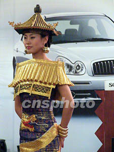 北京一家汽車俱樂部在四月春日請身穿仿中國宮廷建筑服飾的時裝模特,以服飾的華麗高貴為新興的時尚汽車生活助興。作者:王麗南