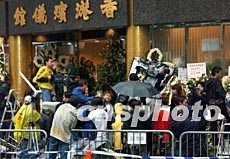 已故歌星張國榮設在香港殯儀館的靈堂于四月七日傍晚6時至8時開放,眾多記者冒雨匯集殯儀館采訪。錢興強 攝