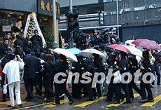 已故歌星張國榮設在香港殯儀館的靈堂于四月七日傍晚6時至8時開放,眾多歌迷冒雨前來致祭。錢興強 攝