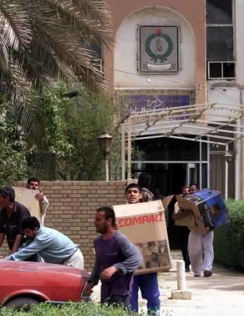 路透社記者看到伊拉克人群首先洗劫了設(shè)在巴格達(dá)運(yùn)河賓館的聯(lián)合國(guó)駐伊拉克辦事機(jī)構(gòu)。另有一名目擊者稱(chēng),伊拉克劫掠者還在遭到美軍轟炸的伊拉克奧林匹克委員會(huì)大樓附近大肆搶掠各家體育用品商店里的貨物。