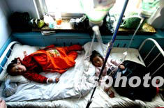 “三一九”豆奶事件后二十天,五歲的史雨平(右)與六歲的王秀文仍在海城市中心醫(yī)院打點滴。當(dāng)?shù)卣Q,自3月19日當(dāng)?shù)?所小學(xué)學(xué)生飲用豆奶以來,先后已有2500多名學(xué)生出現(xiàn)了腹痛、頭暈、惡心等不良反應(yīng)。作者:鄭萍萍