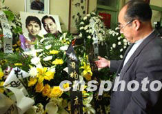 “這可能是五十年代末六十年代初媽媽演《花為媒》時期的合影。是他們生前最喜歡的合影之一!眳抢系膼叟畢撬f?蛷d的四壁還掛著很多新鳳霞各個時期的生活照和劇照以及兩老的合影。劉延?xùn)|、胡德平、張鍥、李默然等人和文化部等單位都送來了花籃。很多客廳里擺不下的花籃只好擺到樓道里。吳霜說:“劉延?xùn)|部長昨天勉勵我們說,你們的父母是杰出的藝術(shù)家,你們要繼承他們的事業(yè),要像他們那樣做光明磊落的人!薄白蛱靵淼娜丝商嗔耍芏喽际瞧甙耸畾q的老人,如丁聰、黃苗子夫婦等,有些走路都要別人攙著,來到靈前痛哭流涕。老爺子為人好,朋友多!眳羌业暮糜褟埵⒋夯貞浾f,昨天來的最高壽的就是黃苗子他老人家,今年九十了。