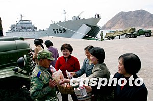 駐守在中國(guó)渤海深處一座小島上的數(shù)百名民眾,得知與他們朝夕相處的解放軍某導(dǎo)彈部隊(duì)官兵要外出執(zhí)行春季任務(wù)時(shí),紛紛送來海產(chǎn)品等到碼頭為官兵送行。作者:崔文斌
