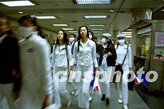 幾名上海國(guó)際汽車(chē)展的車(chē)模小姐二十四日在上海地鐵匆匆而行。為了控制“非典”在滬蔓延,上海國(guó)際汽車(chē)展今日提前閉幕。作者:劉殊瑾