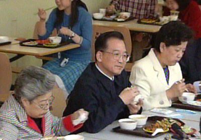 總理徑直來到售飯窗口,拿起一個托盤,要了紅燒豆腐和木須肉兩個菜,一碗玉米粥,一碗紅米粥,一碗米飯,有位同學(xué)忙著把自己的餐卡借給總理劃卡?偫韺Υ蠹艺f:“我今天胃口特別好!”同行的吳儀也在一旁風(fēng)趣地說:“來了北大,看到同學(xué)好好的,飯量都大增了!”
