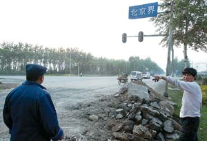 記者停車(chē)觀(guān)察,路旁的水泥柱上掛著一塊“北京界”的牌子,這里是北京市和河北省香河縣交界的地方。
