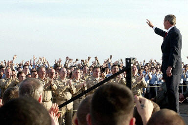 美東部時(shí)間5月1日,美國(guó)總統(tǒng)布什在從海灣返航的“林肯”號(hào)航母上發(fā)表講話,稱伊拉克戰(zhàn)爭(zhēng)的“主要戰(zhàn)斗行動(dòng)”已經(jīng)結(jié)束,聯(lián)軍在戰(zhàn)斗中取得了勝利。