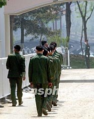 武警官兵五月二日已經(jīng)隔離北京小湯山戰(zhàn)地醫(yī)院,護衛(wèi)解放軍白衣戰(zhàn)士迎戰(zhàn)“非典”。作者:賈國榮