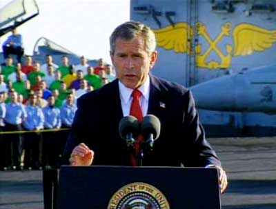 在充滿感情的言辭中,布什不僅僅稱贊推翻薩達(dá)姆政權(quán)的美軍官兵,更是大講特講“9-11”恐怖襲擊,從而將伊拉克戰(zhàn)爭(zhēng)與反恐戰(zhàn)爭(zhēng)融為一體,布什用充滿感情的言辭說(shuō):“我們不應(yīng)該忘記9-11遇難的人們,不應(yīng)該忘記遇難者們打的最后一個(gè)電話,不應(yīng)該忘記孩子們慘遭冷酷的謀殺,不應(yīng)該忘記在廢墟中搜尋的日子。因?yàn)檫@些恐怖襲擊,因?yàn)榭植婪肿雍椭С终邆兿蛎绹?guó)宣戰(zhàn),所以他們也得到了戰(zhàn)爭(zhēng)的報(bào)應(yīng)!辈际策用強(qiáng)硬的措辭警告任何“與恐怖組織有關(guān),試圖擁有大規(guī)模殺傷性武器的無(wú)法無(wú)天的國(guó)家”,它們對(duì)“文明世界形成了嚴(yán)重的威脅,一定會(huì)遭到抵抗的!辈际策@番話顯然是在直接警告伊朗等國(guó)家,并且暗示美國(guó)同樣敢對(duì)它們采取行動(dòng)。