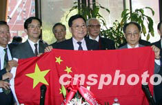 已有七十四年歷史的紐約傳統(tǒng)僑團(tuán)三江公所四日舉行升掛五星紅旗儀式,中國駐紐約總領(lǐng)事張宏喜(右)、副總領(lǐng)事黃惠康(左)專程到紐約華埠向三江公所主席胡運(yùn)熹(中)授贈五星紅旗。三江公所是繼至孝篤親公所之后紐約華埠第二家升掛五星紅旗的傳統(tǒng)僑團(tuán),以此表示擁護(hù)“一個中國”原則,祝愿中國繁榮昌盛。中新社記者:趙海燕