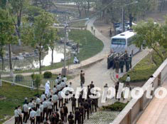 七日晚,小湯山醫(yī)院將接轉(zhuǎn)第五批病人,從而使這里入住的患者總數(shù)達五百人左右。圖為小湯山醫(yī)院隔離區(qū)內(nèi)外。中新社記者:安然