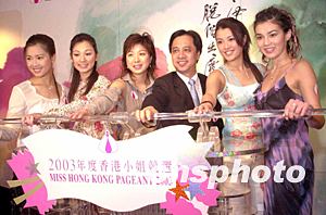 "2003年度香港小姐競選"9日在香港舉行記者會,應屆港姐冠軍林敏俐(右二)、亞軍左慧琪(右一)、季軍胡家惠(左三)等與港姐競選統(tǒng)籌經理何麗全攜手主持本地招募宣傳片啟播儀式。鄧慶樂 攝