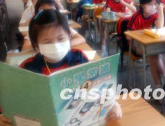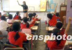 隨著香港“SARS”疫情的逐漸穩(wěn)定,香港數(shù)百所小學(xué)的高年級學(xué)生五月十二日開始復(fù)課。在灣仔學(xué)校復(fù)課的第一天,老師向?qū)W生提問有關(guān)如何防預(yù)“SARS”的基本知識。中新社記者 錢興強 攝