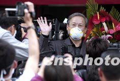 五月十六日下午,與SARS抗?fàn)幜硕奶斓闹袊鴥?nèi)地著名電影導(dǎo)演謝飛康復(fù)出院。謝飛因患SARS于四月二十二日進入北京地壇醫(yī)院接受治療。中新社記者:張煒