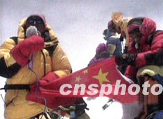 中國登山隊于北京時間五月二十一日下午十三點三十八分勝利登上珠穆朗瑪峰峰頂。圖為尼瑪次仁在峰頂上與隊員展開中國國旗。中新社 圖