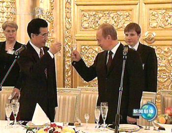 今天是胡錦濤主席訪俄的第二天。當(dāng)?shù)貢r(shí)間今天上午,胡錦濤主席向無(wú)名烈士墓敬獻(xiàn)了花圈,并參觀了俯首山衛(wèi)國(guó)戰(zhàn)爭(zhēng)博物館。中午,普京總統(tǒng)在克里姆林宮為胡錦濤主席舉行了歡迎儀式并進(jìn)行小、大范圍會(huì)談。會(huì)談結(jié)束后,兩國(guó)元首簽署了中俄聯(lián)合聲明等三個(gè)文件。