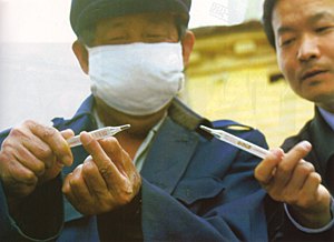 村里將有關(guān)SARS病癥和預防的知識印刷下來,分三次挨家挨戶發(fā)放。村干部把這種宣傳材料叫做“明白紙”。村里還統(tǒng)一購買了一批5斤一桶的過氧乙酸,每戶發(fā)放一桶,人口多的發(fā)兩桶,讓村民自行消毒。