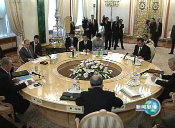 在金碧輝煌的亞歷山大廳,東道國俄羅斯總統(tǒng)普京、輪值主席國哈薩克斯坦總統(tǒng)納扎爾巴耶夫、首次出席峰會的中國國家主席胡錦濤和吉爾吉斯斯坦總統(tǒng)阿卡耶夫、塔吉克斯坦總統(tǒng)拉赫莫諾夫、烏茲別克斯坦總統(tǒng)卡里莫夫,圍坐在圓桌邊,按照俄文字母順序先后發(fā)言。