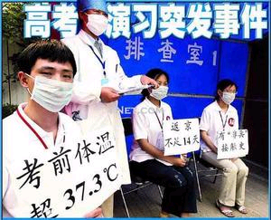 據北京青年報報道,昨天14點50分,101中學考點考生開始進入考點。由老師扮演的考生一一走過“驗證處”,老師進行嚴密排查,不久,“忘帶健康卡”、“考前體溫超過37.3攝氏度”、“返京不足14天”、“有‘非典’接觸史”、“健康卡兩章不全”、“忘帶準考證”等各種“問題考生”舉著醒目的標牌,在引導老師的帶領下一一被臨時“安置”!皢栴}考生”的問題得到解決后,與其他考生一樣進行體溫測試。進入校門的考生在工作人員的指引下,先在臨時洗手池洗手消毒,然后按照考場示意圖去考場位置。