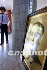 隨著非典疫情的平穩(wěn),北京銷售市場(chǎng)人氣上升,各大商場(chǎng)抓住時(shí)機(jī)促銷商品,北京西單一家工藝品商店特制售價(jià)為三千九百元的巨型銅版毛澤東畫像擺放門前,以求好運(yùn)。中新社記者:廖文靜