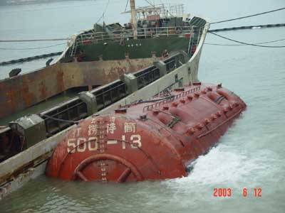 “華頂山”號沉沒后,海事部門決定采取“浮筒打撈法”,也就是將4只浮力總計2000噸的浮筒固定在沉船兩側(cè),然后向浮筒內(nèi)注入壓縮空氣,讓沉船與浮筒一起浮出水面。經(jīng)過救撈人員連續(xù)數(shù)日的緊張調(diào)試安裝,昨天下午,壓縮空氣被注入浮筒,沉默在水中15天的“華頂山”號終于慢慢浮出水面。(劉立忠、王蔚然)