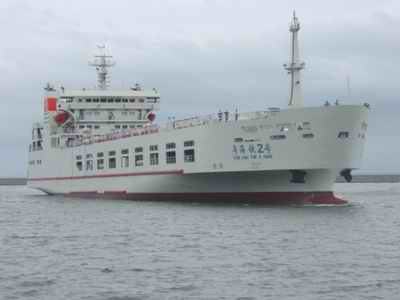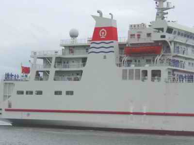 據(jù)了解,“鐵二號(hào)”從設(shè)計(jì)到造型、從長(zhǎng)相到身材,幾乎和“鐵一號(hào)”沒有什么差異?傞L(zhǎng)度一百六十五點(diǎn)四米,寬二十二點(diǎn)六米,排水量一萬二千四百噸,載車重量四千二百噸,主甲板可以載貨運(yùn)列車車廂四十節(jié)或客運(yùn)列車十八節(jié)、旅客一千三百六十人。