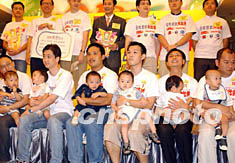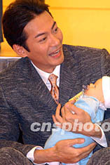 香港藝員江華,六月十五日在香港時(shí)代廣場(chǎng)舉行的歡度父親節(jié)活動(dòng)上,風(fēng)趣示范抱BB做運(yùn)動(dòng)一分鍾。錢興強(qiáng) 攝