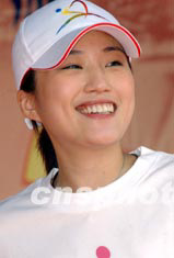 香港藝員谷祖琳,2003年6月22日在香港維多利亞公園舉行的“同心攜手畫出彩虹”嘉年華活動上,為賓客們演唱歌曲。中新社記者 錢興強