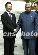 國務(wù)院總理溫家寶二十三日在北京舉行歡迎儀式,歡迎印度總理瓦杰帕伊訪華。中新社記者:鄭萍萍
