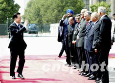 國務(wù)院總理溫家寶二十三日在北京向印度總理瓦杰帕伊的隨行官員揮手致意。中新社記者:鄭萍萍