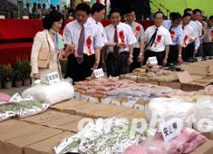 中新社廣州六月二十六日電 (唐貴江陳瑞光)二00三年粵港澳“六·二六”國際禁毒日聯(lián)合銷毀毒品大會(huì)二十六日上午在廣州舉行,公開銷毀了警方繳獲的海洛因、冰毒、搖頭丸等各類毒品共五噸。