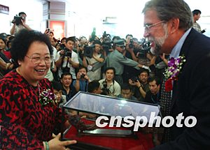 WHO駐華顧問羅伯特.帝茲接收全國政協(xié)委員、中國紫檀博物館館長陳麗華女士贈送的紫檀木雕如意,接收這份各界感謝WHO支持中國戰(zhàn)勝SARS病毒的心意。中新社記者:賈國榮