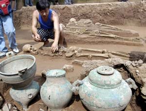 在發(fā)掘現(xiàn)場(chǎng)可以看到,遺址東南部寬7.3米、長(zhǎng)9米以上的墓坑內(nèi),3具長(zhǎng)1.6米左右的尸骨頭朝南方,整齊地?cái)[放在墓坑中央,臉部全部向東。陳祖軍告訴記者:“這些尸體的左臂卷曲在胸前,右手都是處于非正常狀態(tài),有的是小臂和大臂緊緊地貼在一起,有的肘關(guān)節(jié)已經(jīng)錯(cuò)位,所以這3具尸骨很可能是殉葬或者祭祀的犧牲品。在祭祀品下面可以隱約看見(jiàn)板狀的東西,可能是棺材。在厚約30厘米的土層下,可能埋有墓葬的主人。從出土器物的規(guī)格和數(shù)量來(lái)看,肯定墓葬主人是巴國(guó)的一位王侯!保牐