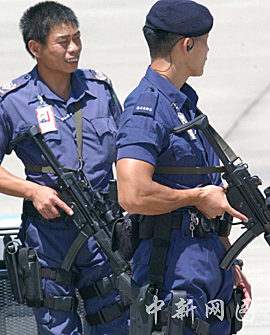 中國國務(wù)院總理溫家寶,六月二十九日中午乘專機(jī)抵達(dá)香港國際機(jī)場,在香港進(jìn)行為期三天的訪問。圖為香港國際機(jī)加強(qiáng)警戒。中新社記者 錢興強(qiáng) 攝